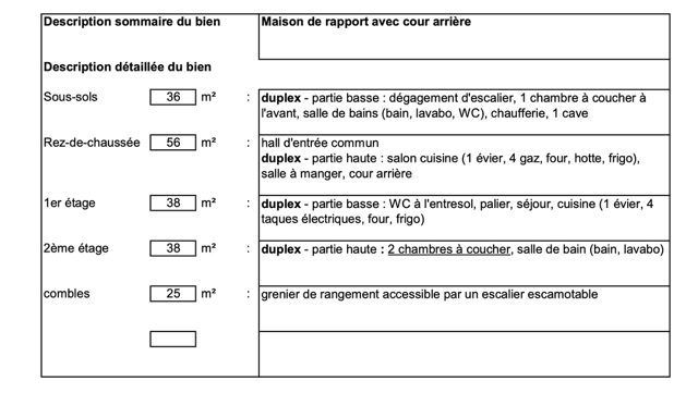 - Ground floor - 56m2: living kitchen (1 sink, 4 gas, oven, hood, fridge), dining room, south-facing rear courtyard, PEB F
